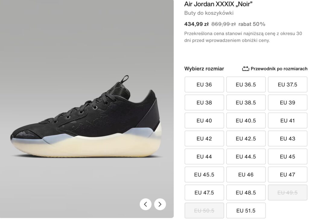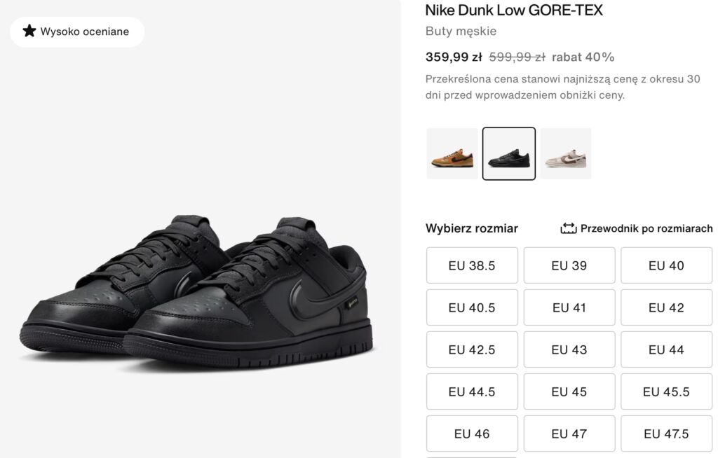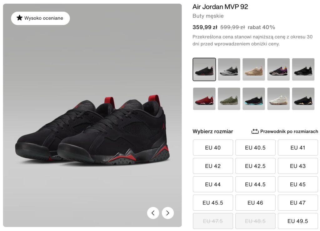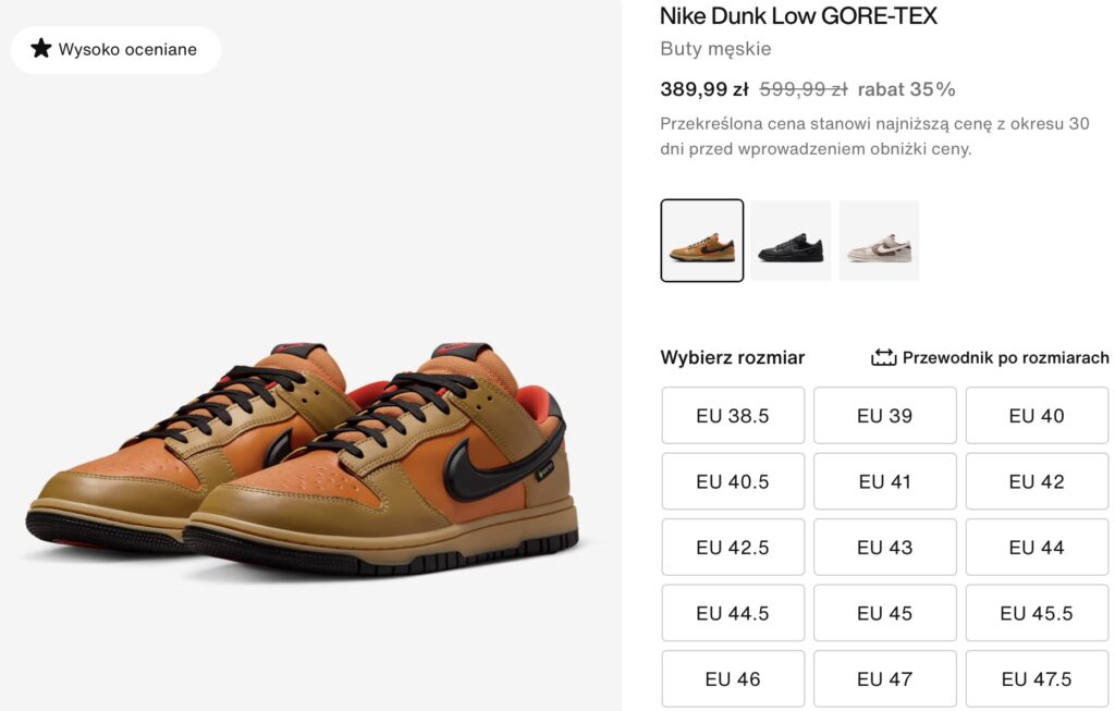 Poniżej kilkanaście przykładów. Dajemy też screeny z pokazaną rozmiarówką, abyście zobaczyli, że to nie jest tak, że to są pojedyncze rozmiary dostępne. Wiele produktów ma mówiąc najogólniej „pełną rozmiarówkę”, czyli wiele popularnych rozmiarów. Całą ofertę znajdziecie w oficjalnym sklepie Nike.