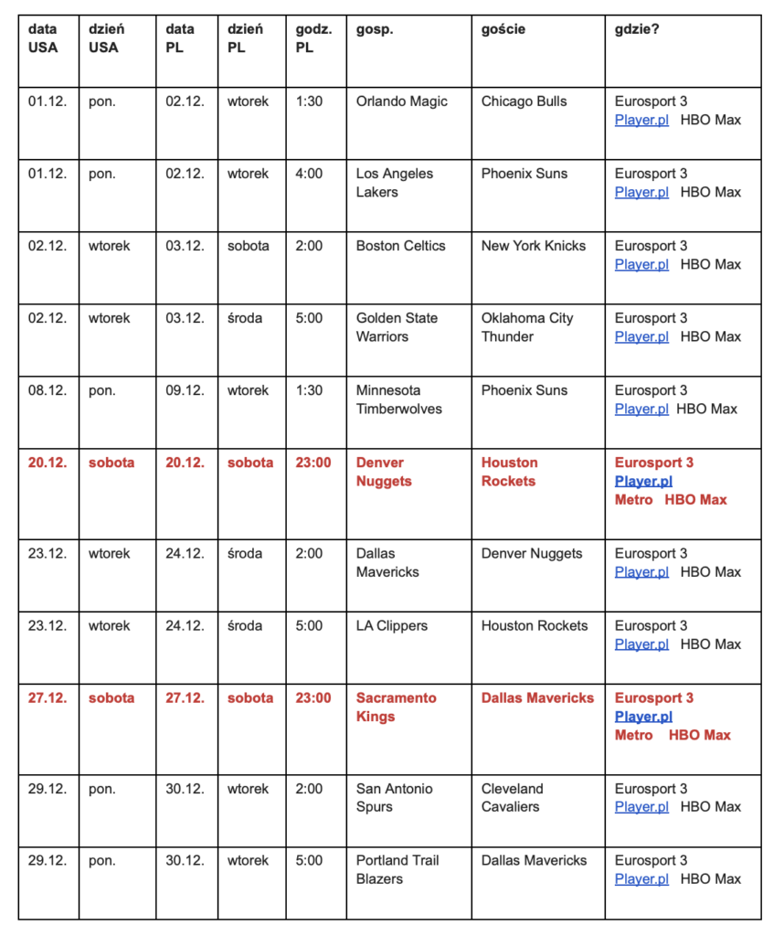 23.12.wtorek24.12.środa5:00LA ClippersHouston RocketsEurosport 3