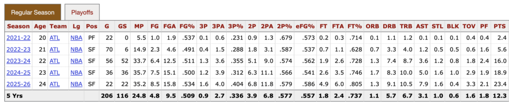 Dla Younga to ósmy sezon w NBA. Jego fani często przypominają jaką Hawks sprawili niespodziankę w 2021 roku, kiedy doszli aż do finału konferencji Wschodniej. Najpierw wygrali z Knicks (4:1), a potem Sixers (4:3) i przegrali dopiero z Milwaukee Bucks (1:4), którzy sięgnęli wtedy po mistrzostwo.