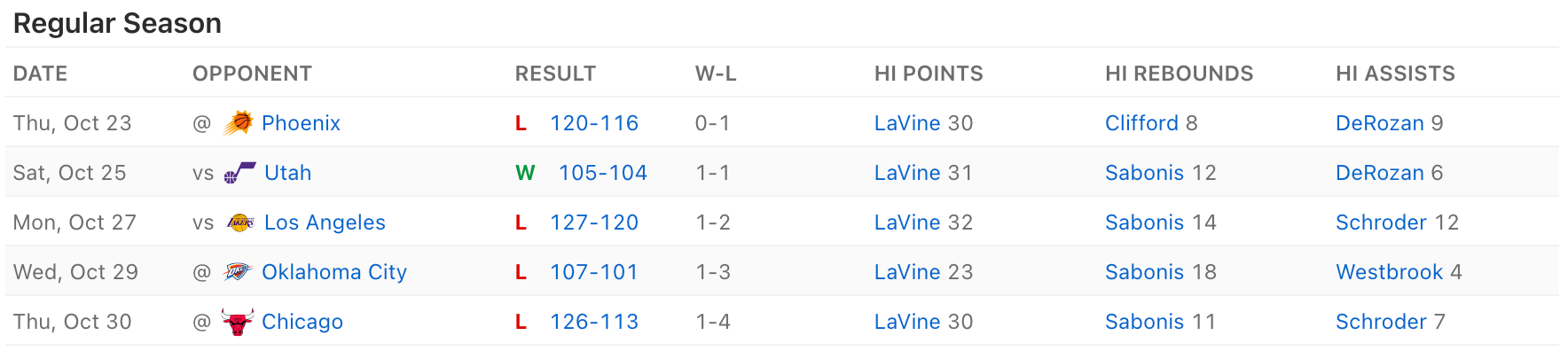 Kings przegrali jak dotąd z Phoenix Suns, Los Angeles Lakers, Oklahoma City Thunder i Chicago Bulls. Jedyne zwycięstwo zaliczyli przeciwko Utah Jazz, którzy raczej nie włączą się do walki o czołową dziesiątkę Zachodu, a I tak potrzebowali do tego zwycięskiego rzutu Domantasa Sabonisa w ostatnich sekundach rywalizacji.