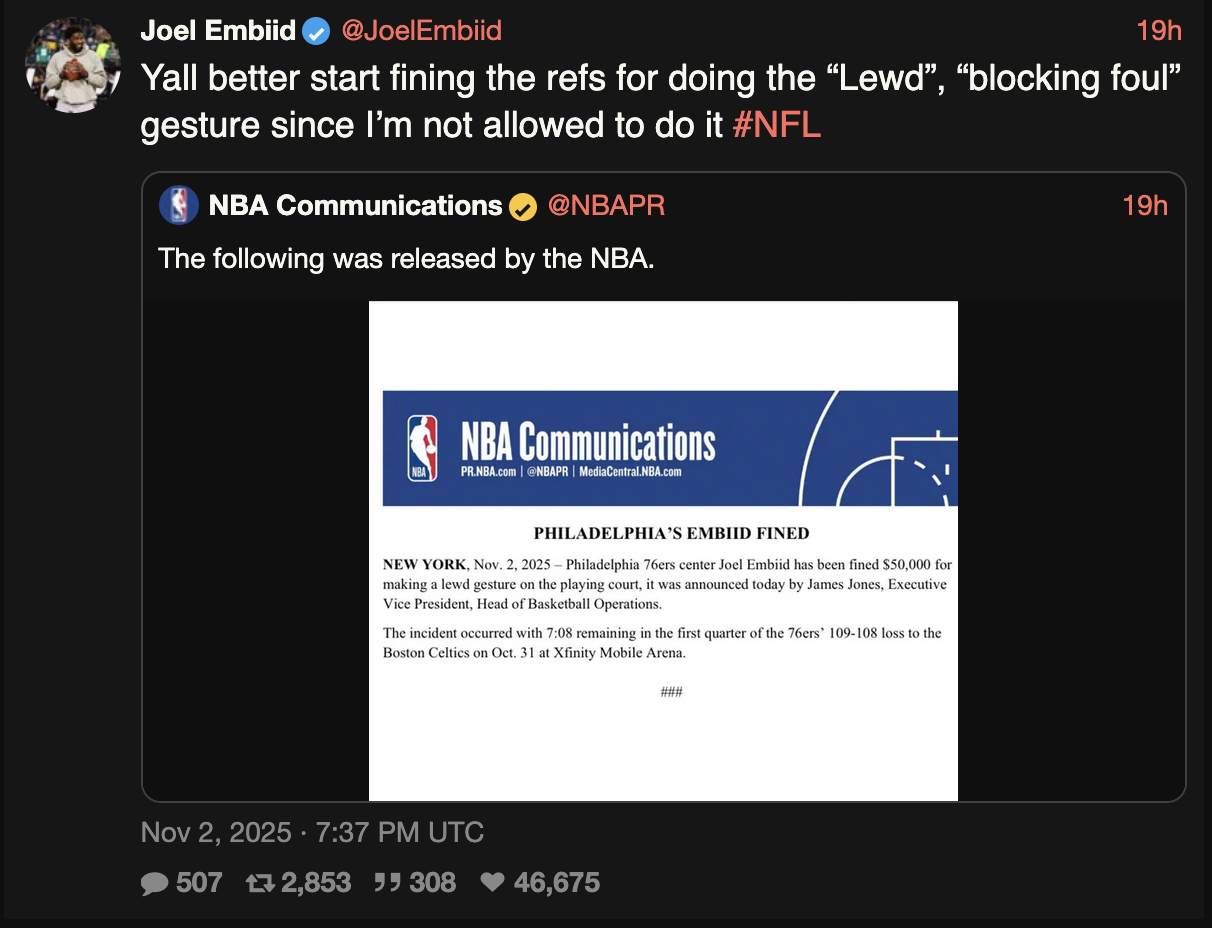 Władze NBA ukarały Joela Embiida grzywną w wysokości 50 tys. dol. za „nieprzyzwoity” gest, który środkowy Philadelphia 76ers wykonał w trakcie meczu z Boston Celtics. Po jednej z akcji środkowy uderzył się rękami w okolice pachwin — władze uznały to za obraźliwe zachowanie. Embiid zdążył się już odnieść do kary, zwracając uwagę, że podobny gest wykonują w trakcie meczu sędziowie.
