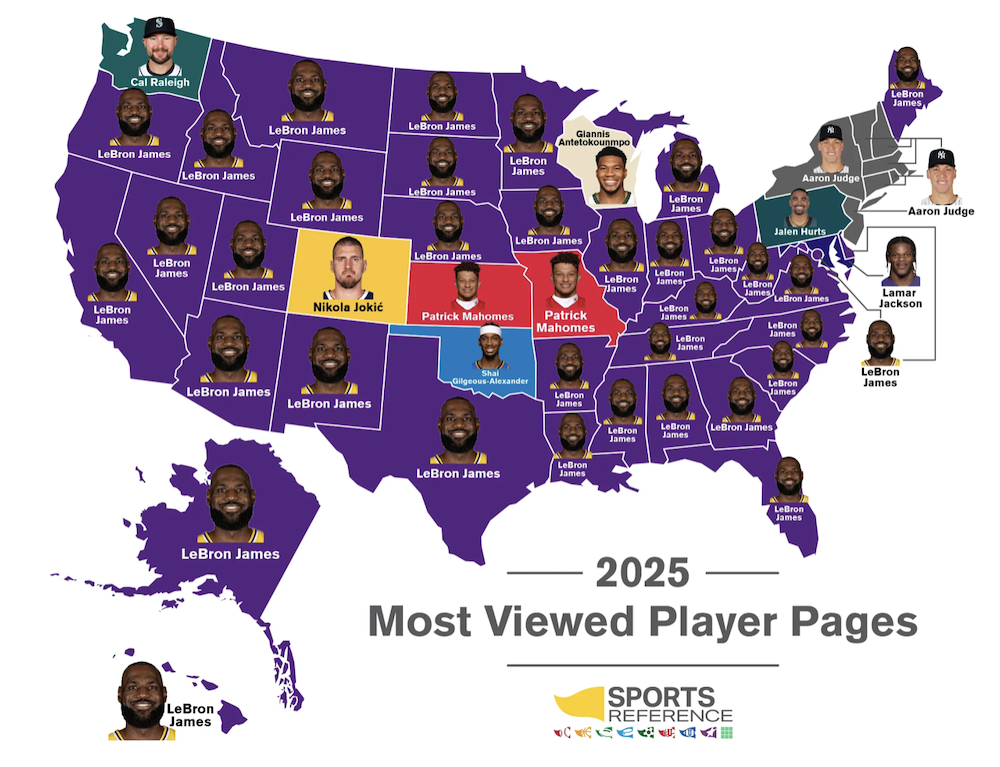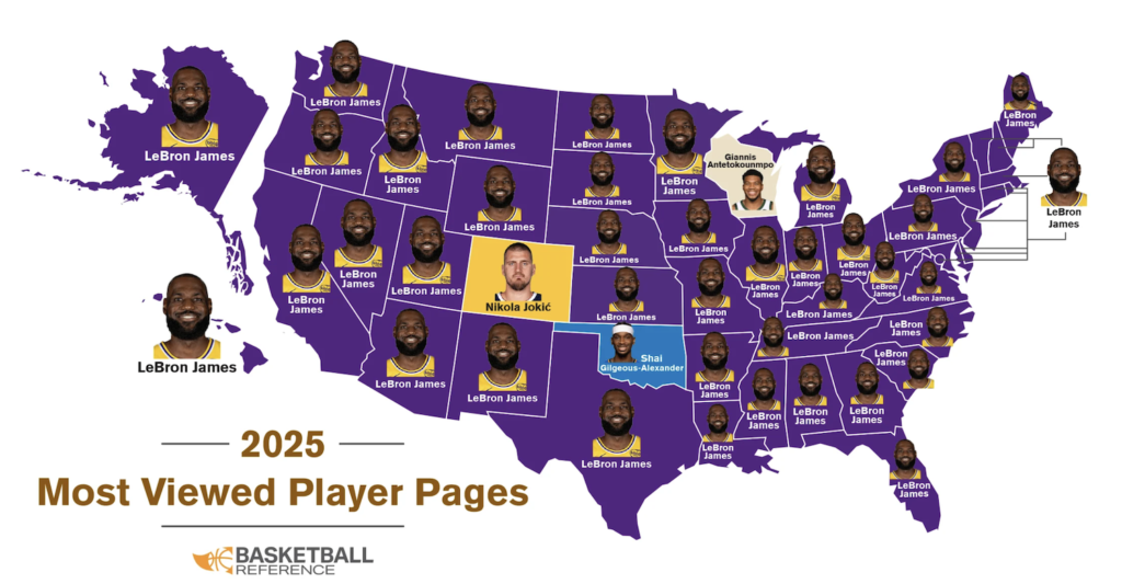 Jak rozumiemy słowo najpopularniejszy w tym przypadku? Chodzi po prostu o to, że z danego stanu najwięcej osób ogląda stronę danego zawodnika na stronie Basketball Reference. W USA w zdecydowanej większości jest to LeBron James. Tylko Giannis, Nikola Jokić i Shai „wygrali” w stanach, w których są ich drużyny.