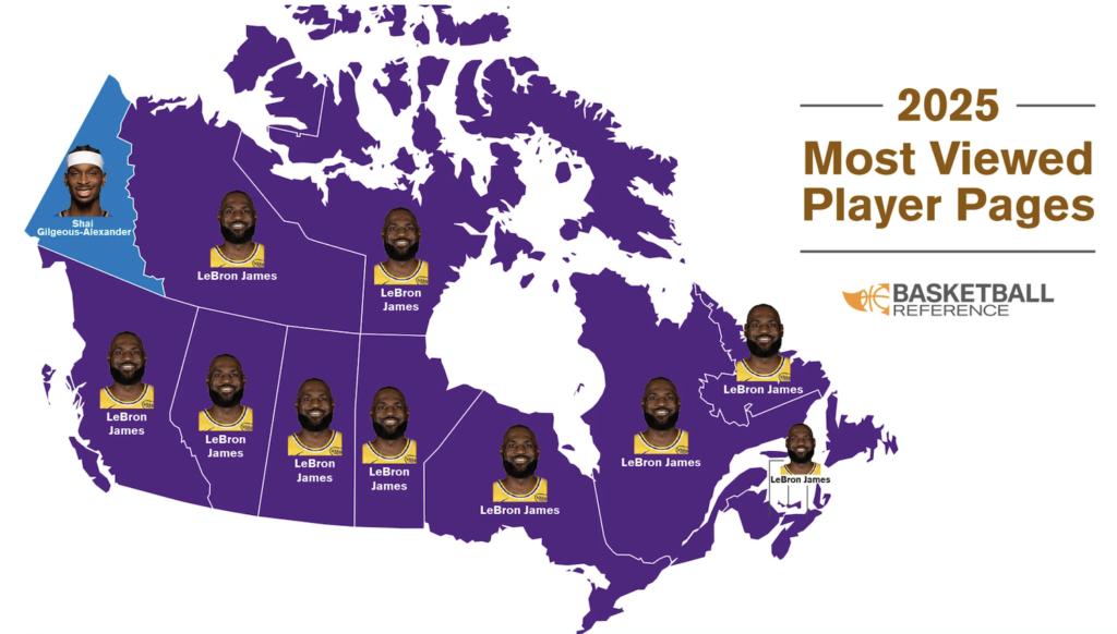 Podobnie jest w Kanadzie. Tutaj też w 2025 roku dominował LeBron James.