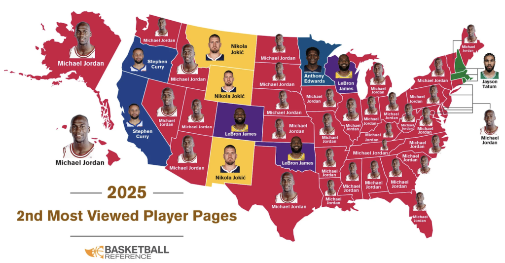 Dużo ciekawiej robi się jednak, kiedy weźmie się pod uwagę 2. miejsce, to znaczy drugiego zawodnika na liście najpopularniejszych w całym stanie. Zaskakujące jest to, że w zdecydowanej większości drugim najczęściej odwiedzanym profilem zawodnika był w 2025 roku Michael Jordan, który przecież nie gra w NBA od ponad 20 lat!