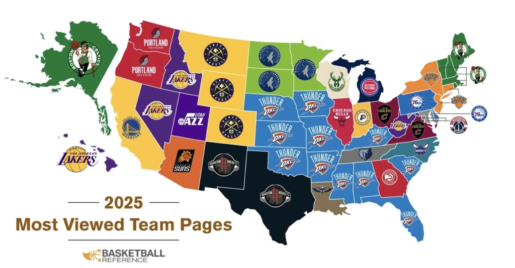 Jak co roku portal Basketball Reference, czyli największy i najbardziej znany portal ze wszystkimi możliwymi statystykami koszykarzy i drużyn NBA, przygotował zestawienie o tym kto jest najbardziej popularny w NBA – który zawodnik i która drużyna w danym stanie w USA oraz w danym regionie w Kanadzie. Niektóre wyniki mogą zaskakiwać. Trzeba jednak pamiętać, że to są dane tylko ze Stanów Zjednoczonych i Kanady.