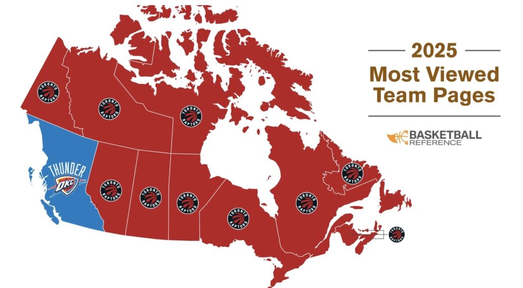 W Kanadzie oczywiście najpopularniejszym zespołem są Toronto Raptors. Z jednym wyjątkiem, w Kolumbii Brytyjskiej częściej odwiedzano stronę OKC.