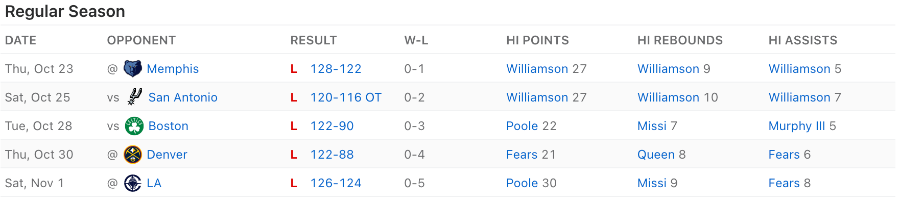 Ekipa z Luizjany jest obecnie jedynym zespołem z Zachodu, który nie ma na koncie dwóch zwycięstw. Co więcej, podopieczni Willie’ego Greena nie wygrali jeszcze ani jednego spotkania (0-5). Nie pomogły huczne zapowiedzi długo wyczekiwanego powrotu Ziona Williamsona, który miał zrzucić sporo zbędnych kilogramów i być tym samym przygotowanym do wprowadzenia Pels na wyższy poziom.