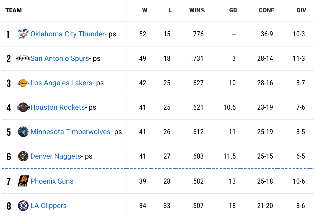 Wilki znajdują się w dosyć trudnym położeniu, bo zaledwie jeden mecz może zdecydować o spadku z 3. na 6. pozycję. Przypomnijmy, jak wygląda obecnie sytuacja w tabeli Konferencji Zachodniej, pamiętając przy tym, że Phoenix Suns również są głodni sukcesów, a Los Angeles Clippers mają za sobą fantastyczny okres i planują gonić czołową szóstkę.