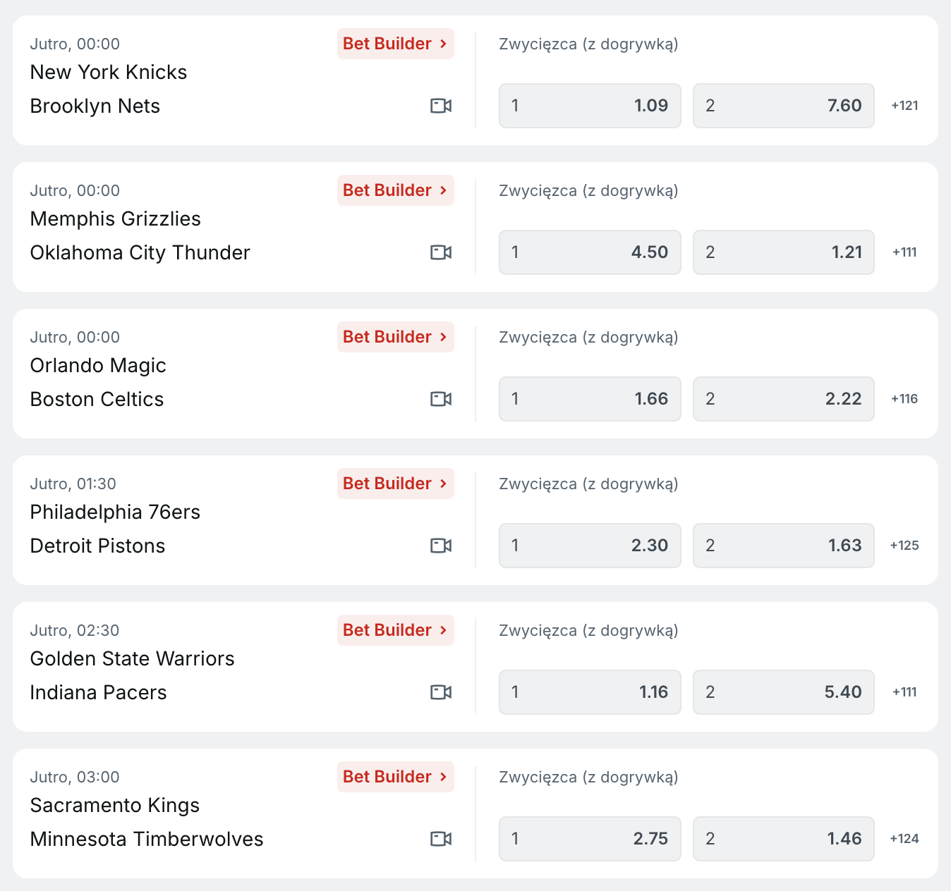 Jeśli natomiast ktoś ma ochotę na więcej koszykówki zza oceanu może poczekać do północy, bo wtedy grać będzie aż sześć drużyn. W Nowym Jorku rozegrane zostaną derby między New York Knicks a Brooklyn Nets i choć eksperci jednoznacznie wskazują na Jalena Brunsona i spółkę, to można spodziewać się, że z powodu rangi meczu, zawodnicy Nets tanio nie oddadzą skóry. Na wschodnim wybrzeżu zagrają jeszcze Orlando Magic z Boston Celtics, jestem pewny, że mecz będzie intensywny, chociażby z powodu rewanżu drużyny Jamal Mosleya za ubiegłoroczne play-offy. W trzecim meczu rozgrywanym o północy czasu polskiego Memphis Grizzlies spróbują postawić się Thunder z Shaiem Gilgeousem Alexandrem. Trudno wróżyć im szczęście, co tylko potwierdzają kursy ekspertów.