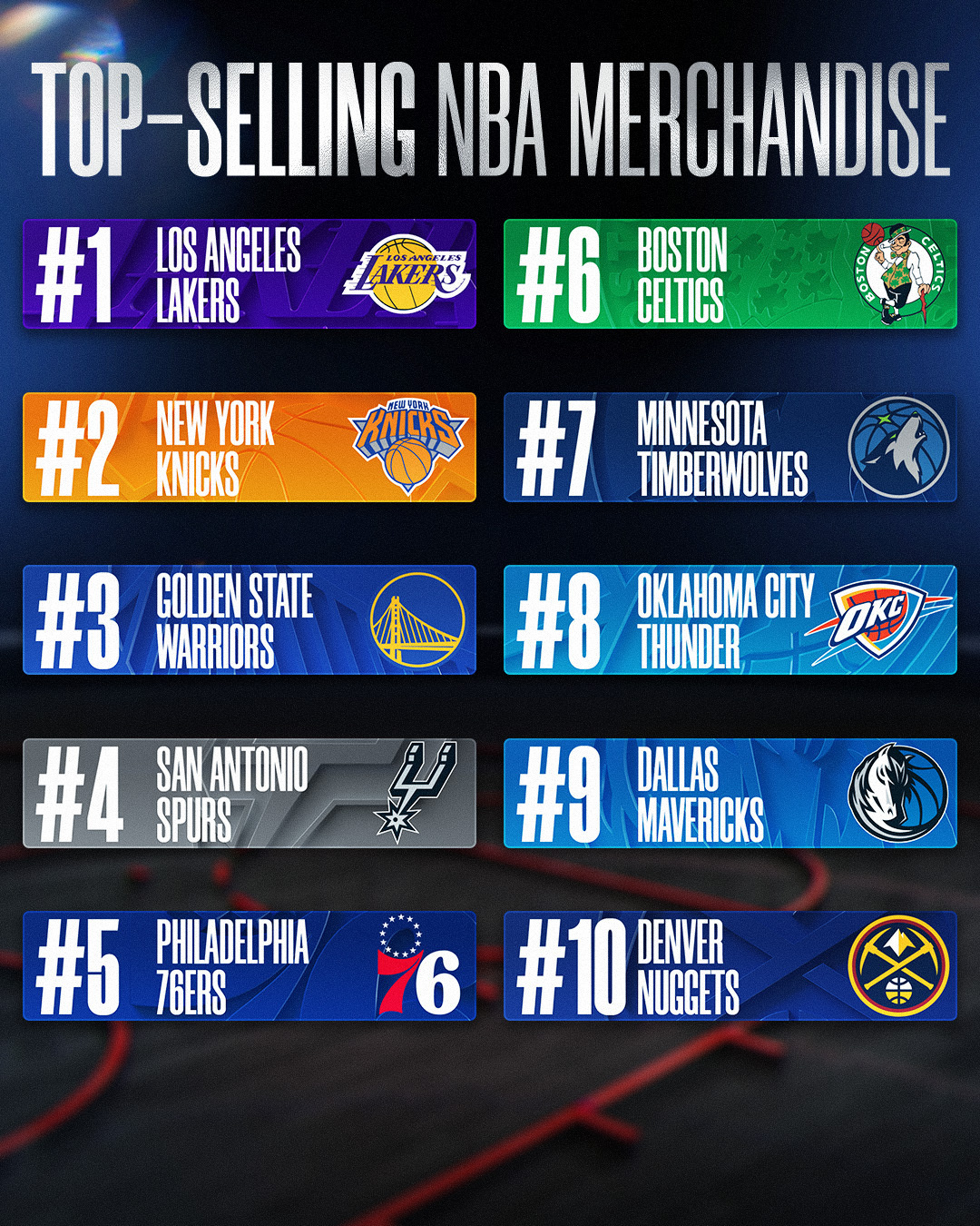 Oddzielna lista dotyczy sprzedaży team merchandise, czyli oficjalnych gadżetów klubowych (w tym też koszulek oczywiście). Tutaj na pierwszym miejscu znaleźli się Los Angeles Lakers.