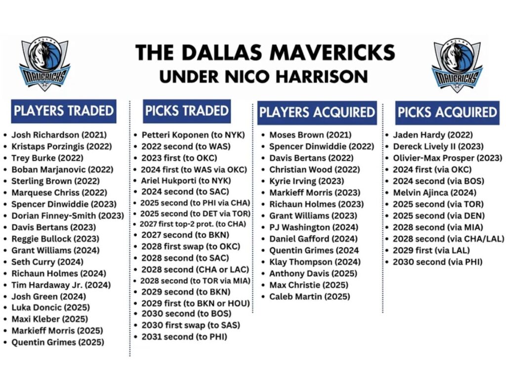 Bobby Marks z ESPN przygotował bardzo ciekawe zestawienie. W pierwszej kolumnie zawodnicy, których Mavs pod wodzą Harrisona wytransferowali, potem wybory w drafcie, który wytransferowali, a następnie zawodnicy, których pozyskali oraz wybory w drafcie, które pozyskali. Mówiąc delikatnie… ciężko to obronić…