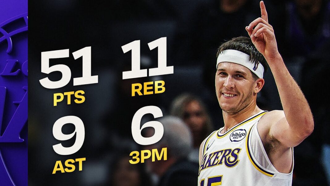 • Bohaterem spotkania bez wątpienia był Austin Reaves, który ustanowił rekord kariery, zdobywając 51 punktów, w tym cztery kluczowe rzuty wolne w ostatnich 32 sekundach. Reaves trafił 12 z 22 rzutów z gry, w tym sześć trójek, osiągając 500. trafiony rzut za trzy w karierze. Dołożył także dziewięć asyst i 11 zbiórek, stając się czwartym graczem w ciągu ostatnich 40 lat z co najmniej 50 punktami, 11 zbiórkami i dziewięcioma asystami w jednym meczu, obok Doncicia, Russella Westbrooka (dwukrotnie) i Jamesa Hardena (dwukrotnie). Ostatnim graczem Lakers z takim osiągnięciem był Elgin Baylor w 1963 roku (50 punktów, 15 zbiórek, 11 asyst przeciwko Boston Celtics).